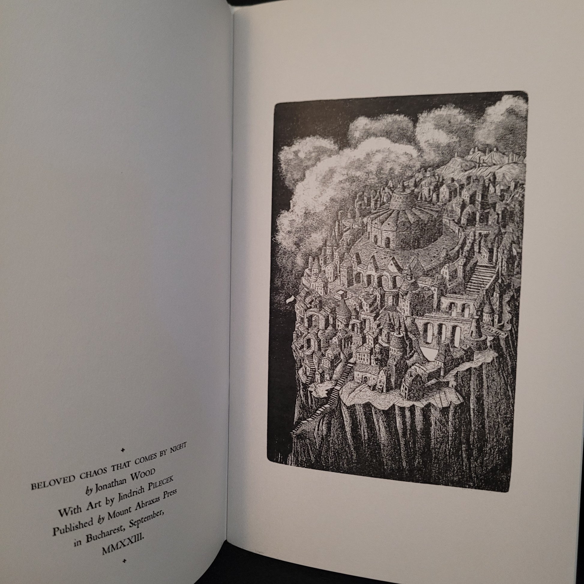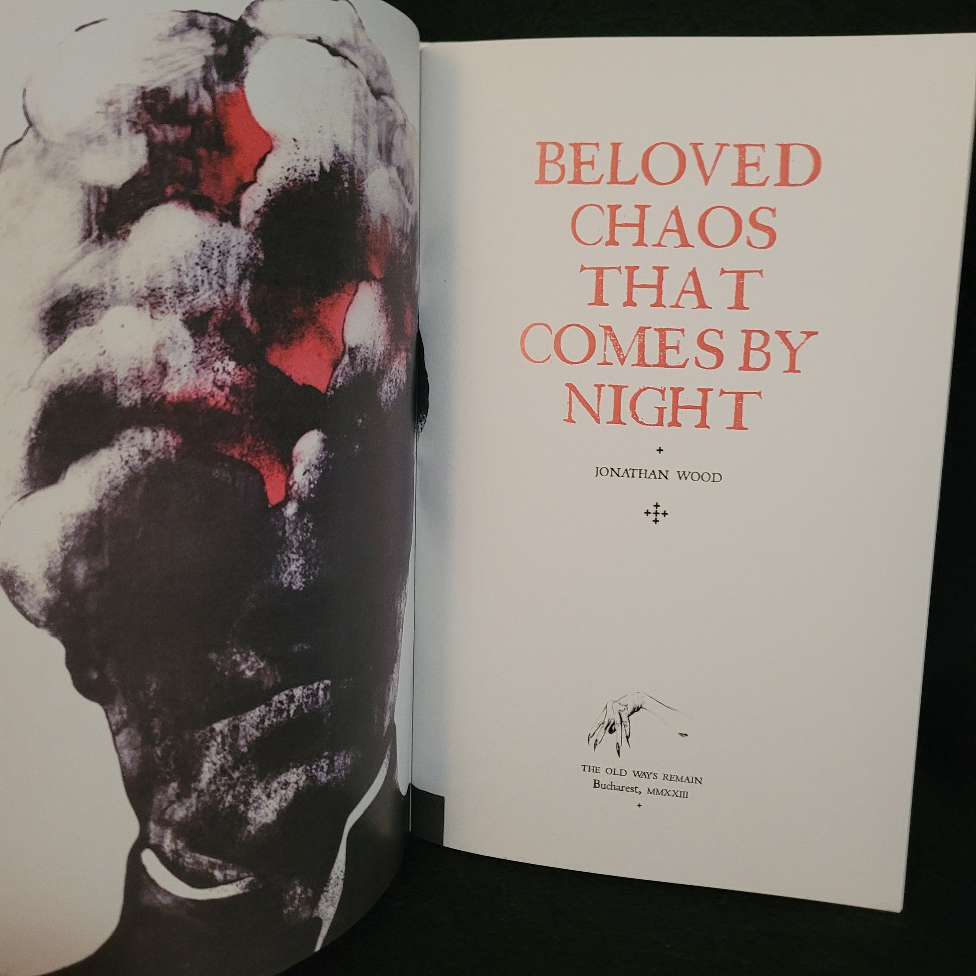 Jonathan Wood. BELOVED CHAOS THAT COMES BY NIGHT, THE OLD WAYS REMAIN. Bucharest: Mount Abraxas Press, 2023. Limited edition deluxe booklet. 34 pages. Art by Jindrich Pilecek.