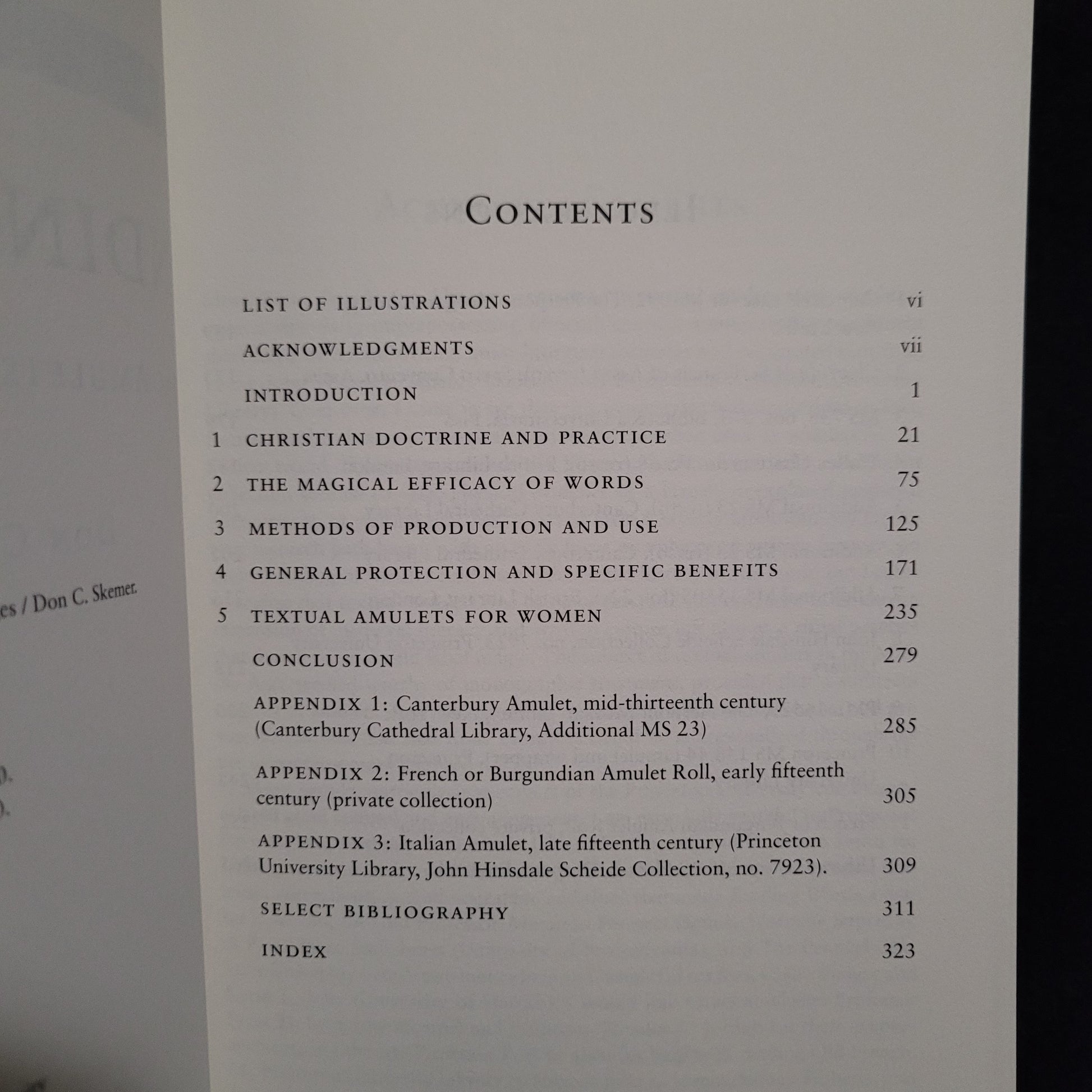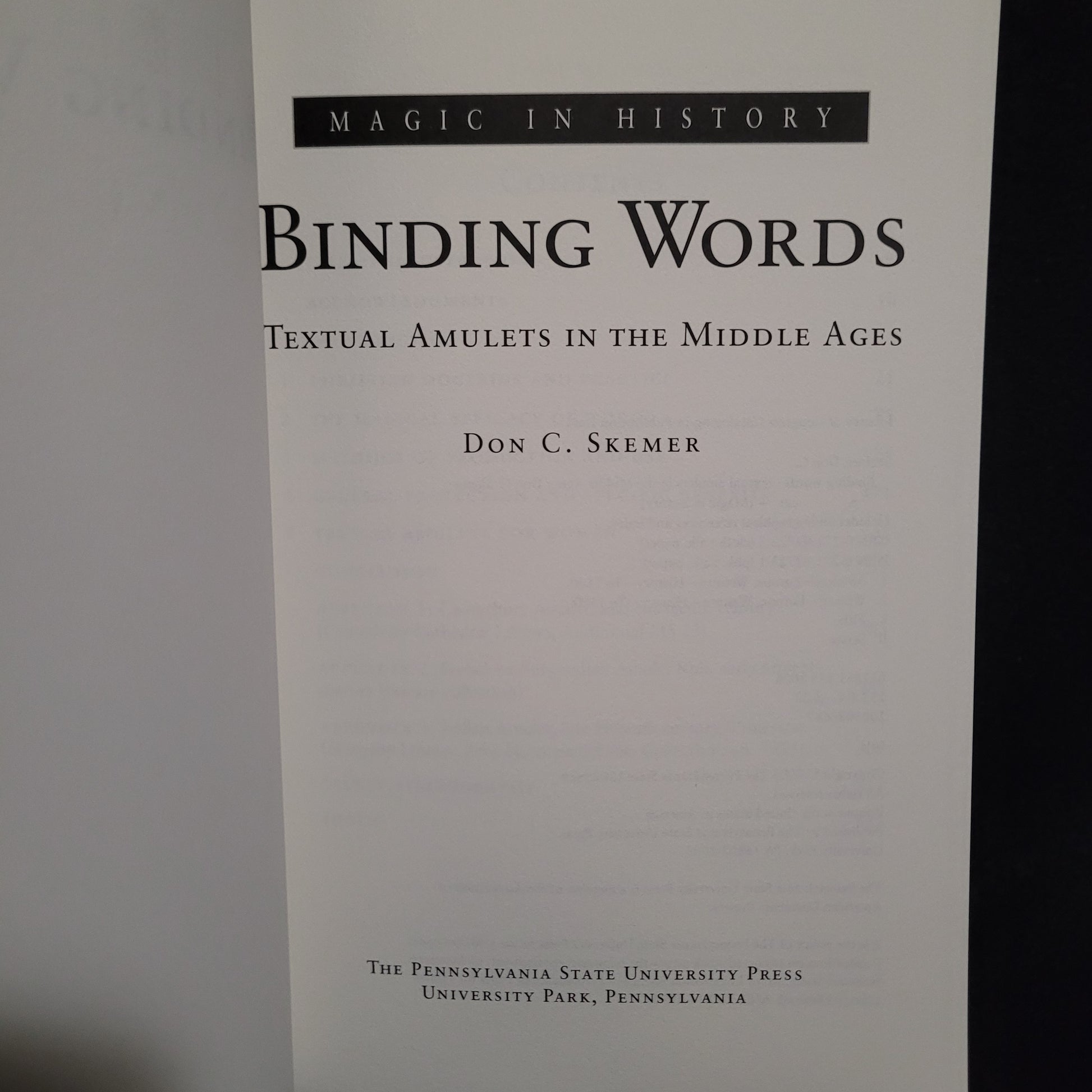 Description from the publisher: "In the Middle Ages, textual amulets—short texts written on parchment or paper and worn on the body—were thought to protect the bearer against enemies, to heal afflictions caused by demonic invasions, and to bring the wearer good fortune. In Binding Words, Don C. Skemer provides the first book-length study of this once-common means of harnessing the magical power of words.