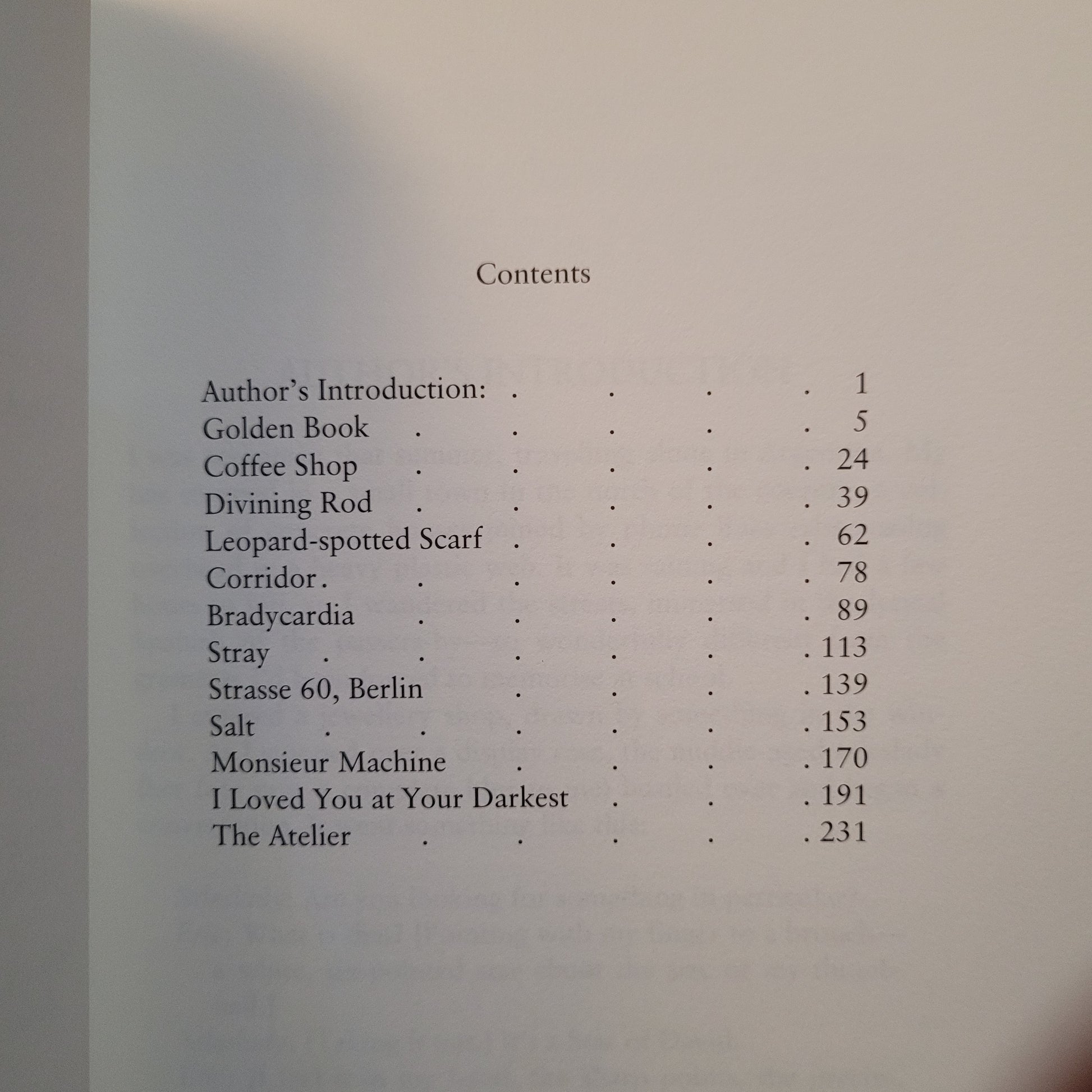 Contents: ‘Author’s Introduction’, ‘Golden Book’, ‘Coffee Shop’, ‘Divining Rod’, ‘Leopard-spotted Scarf’, ‘Corridor’, ‘Bradycardia’, ‘Stray’, ‘Strasse 60, Berlin’, ‘Salt’, ‘Monsieur Machine’, ‘I Loved You at Your Darkest’, ‘The Atelier’.