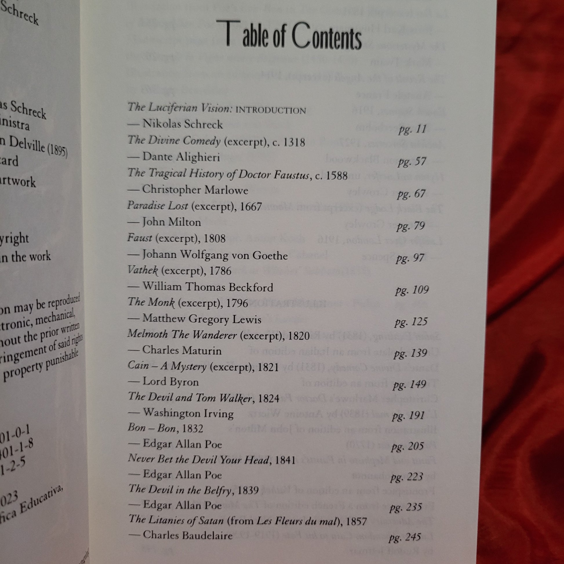 Description from the publisher: "Unholy creations from the world’s greatest authors and artists are bound together in this essential anthology of Luciferian literature.