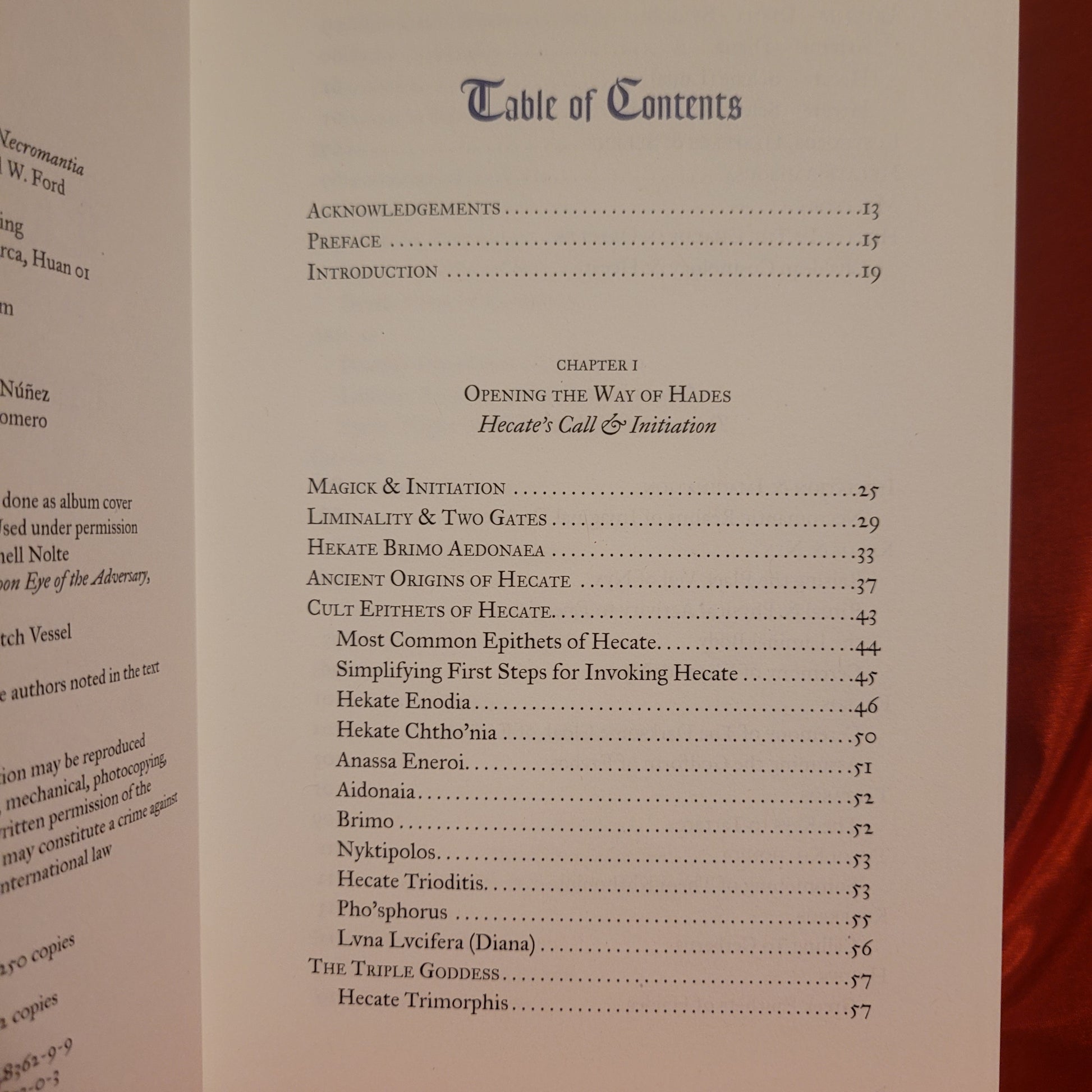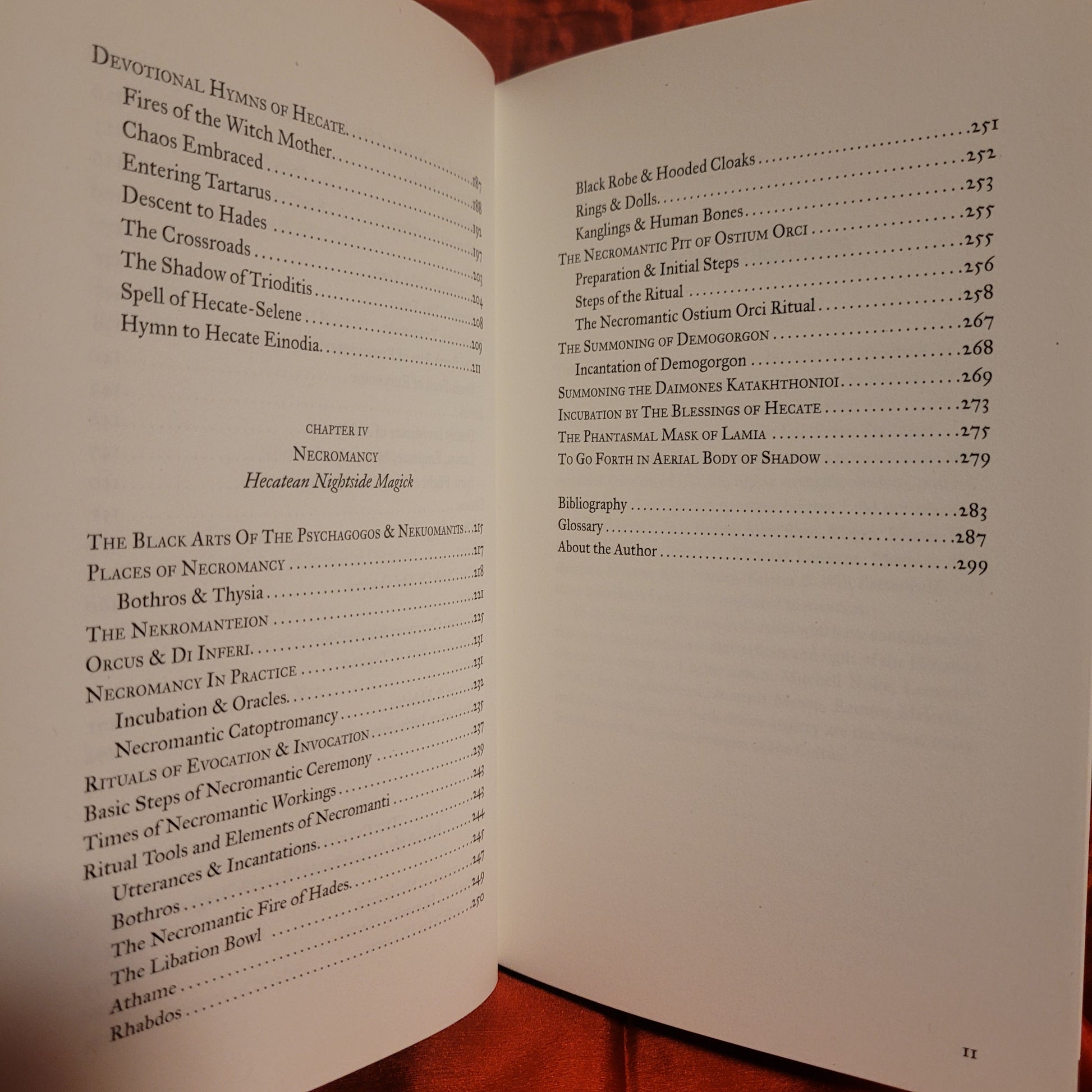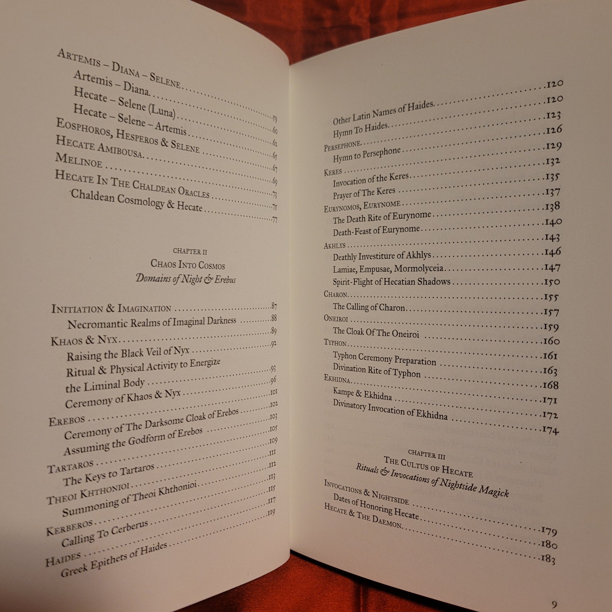 Description from the publisher: This book is a Left-Hand Path exploration of the Nightside manifestations of Hecate, Necromancy, and Black Magick. Necromancy is presented for purposes of divination, paranormal possibilities with seeking daimonic spirits and ghosts, invoking daimonic underworld deities and spirits for the purpose of absorbing energies and Apotheosis.