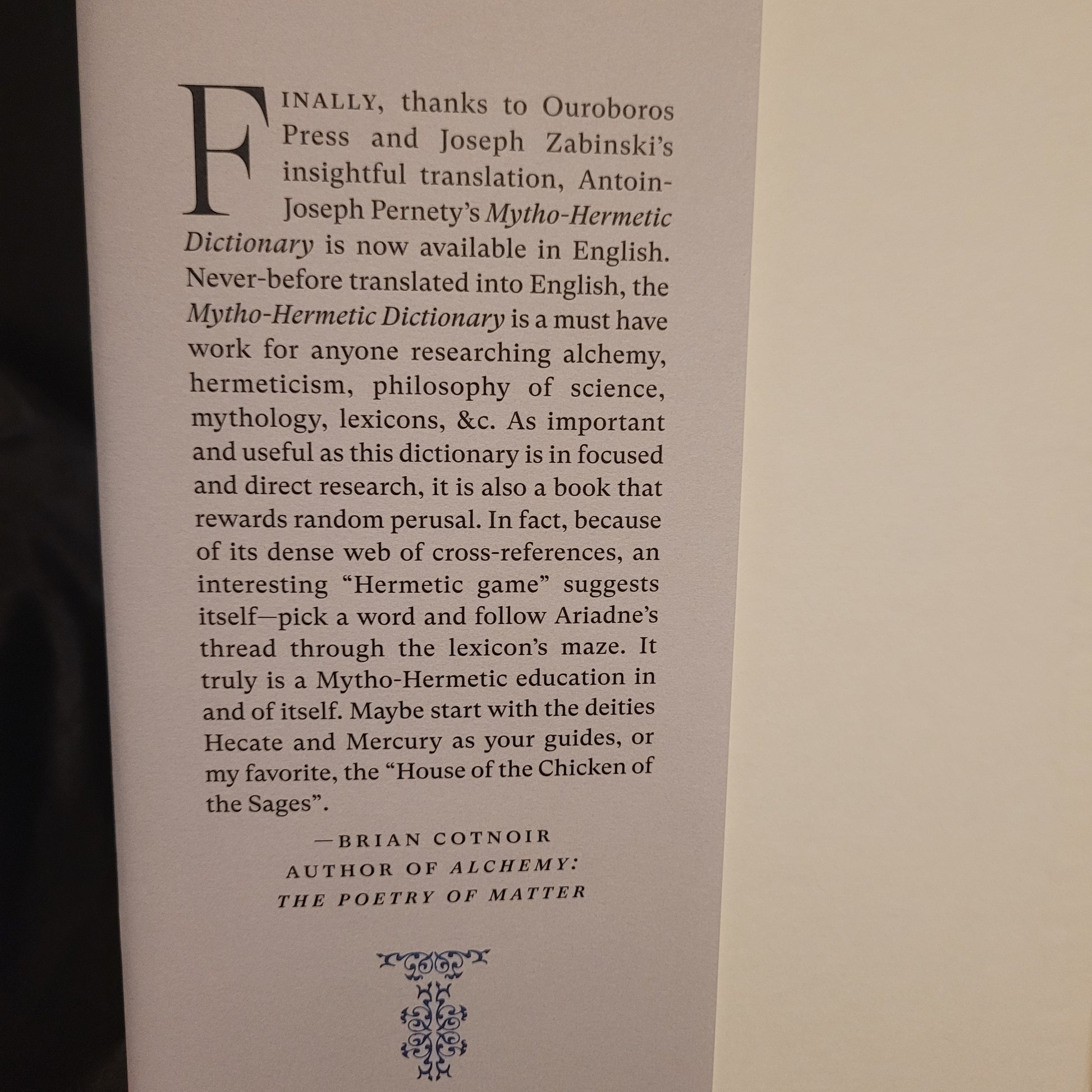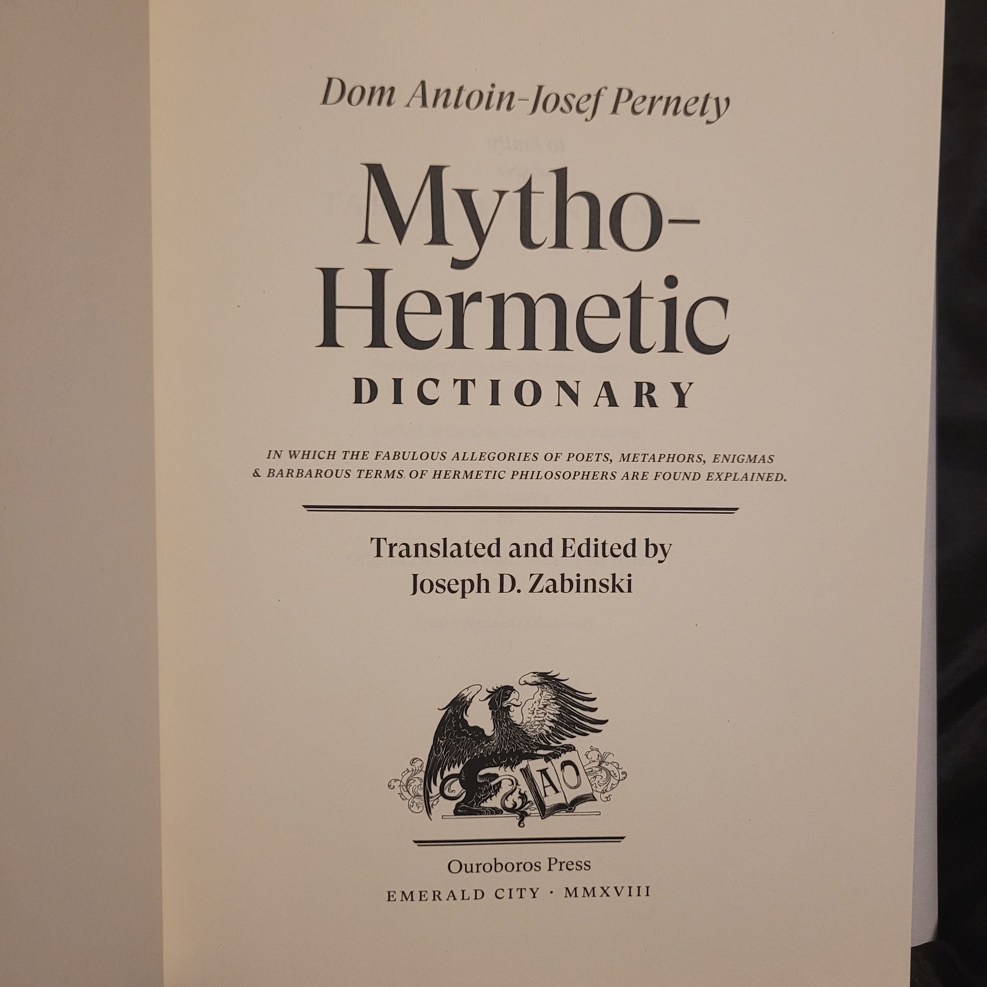 Dom Antoin-Josef Pernety. Mytho-Hermetic Dictionary. Ouroboros Press, 2018. Hardcover with dust jacket. 347 pages. Limited to 1,500 copies.