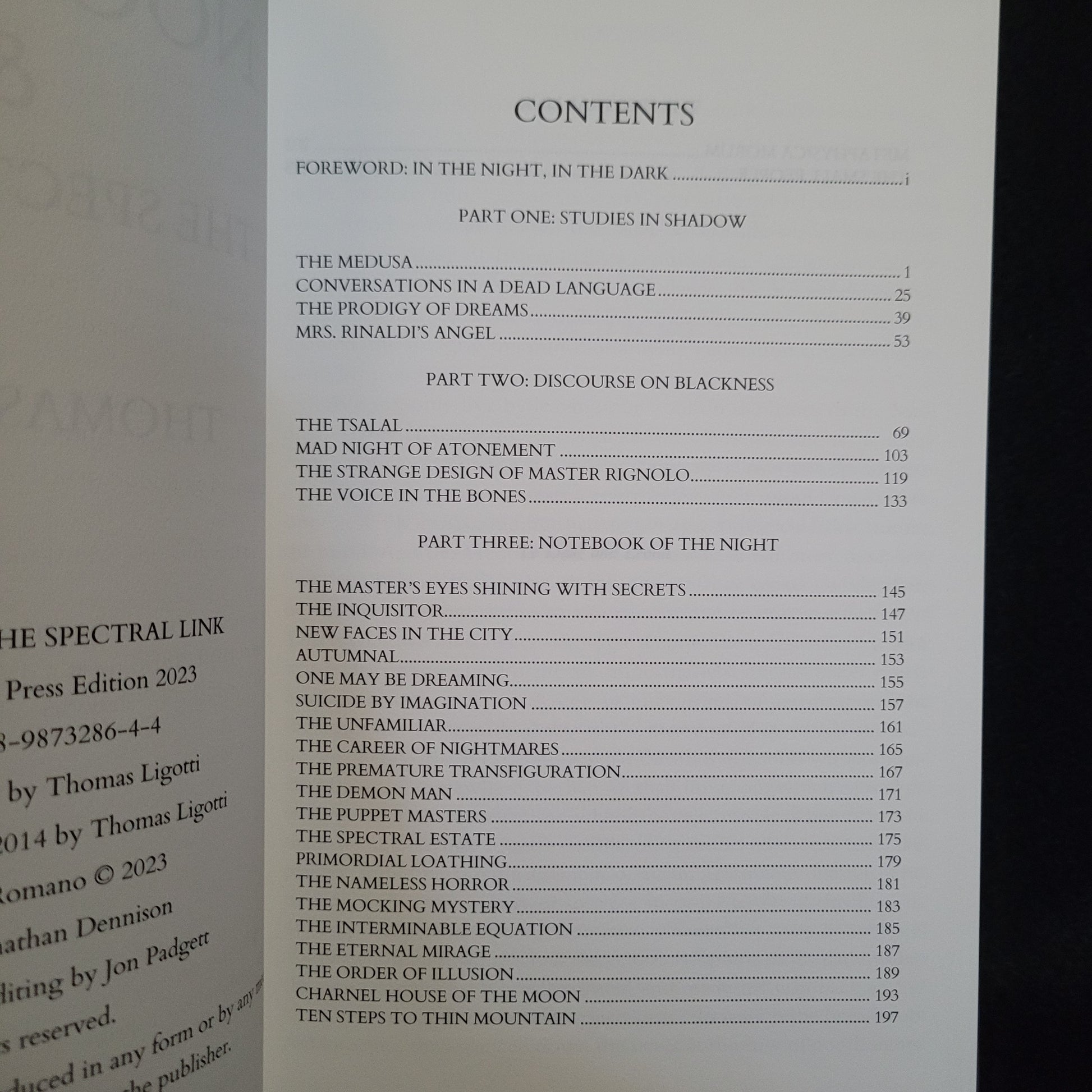 The Spectral Link, Ligotti’s most recently published short story collection, emerged following his near-death experience on the surgeon's table. The first novelette, "Metaphysica Morum," channels all the rage and despair of Ligotti's nonfiction treatise, The Conspiracy Against the Human Race, in both stark and hilarious form. The combined volume ends with Ligotti’s poignant masterpiece, "The Small People," exploring the uncanny terror of being alive in a world where we can never be certain who and what we are.