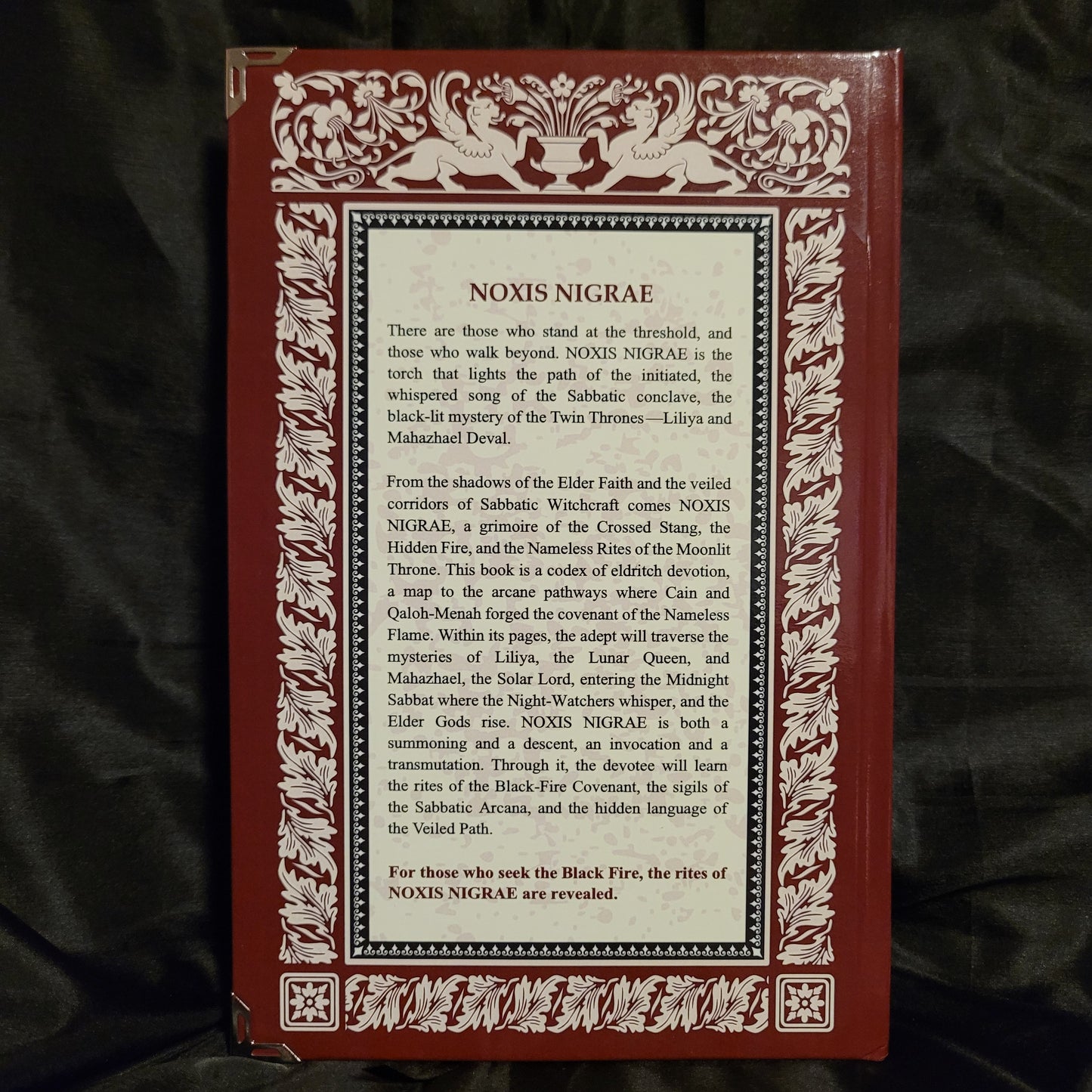 From the shadows of the Elder Faith and the veiled corridors of Sabbatic Witchcraft comes NOXIS NIGRAE, a grimoire of the Crossed Stang, the Hidden Fire, and the Nameless Rites of the Moonlit Throne. This book is a codex of eldritch devotion, a map to the arcane pathways where Cain and Qaloh-Menah forged the covenant of the Nameless Flame. Within its pages, the adept will traverse the mysteries of Liliya, the Lunar Queen, and Mahazhael, the Solar Lord, entering the Midnight Sabbat where the Night-Watchers whisper, and the Elder Gods rise. NOXIS NIGRAE is both a summoning and a descent, an invocation and a transmutation. Through it, the devotee will learn the rites of the Black-Fire Covenant, the sigils of the Sabbatic Arcana, and the hidden language of the Veiled Path.