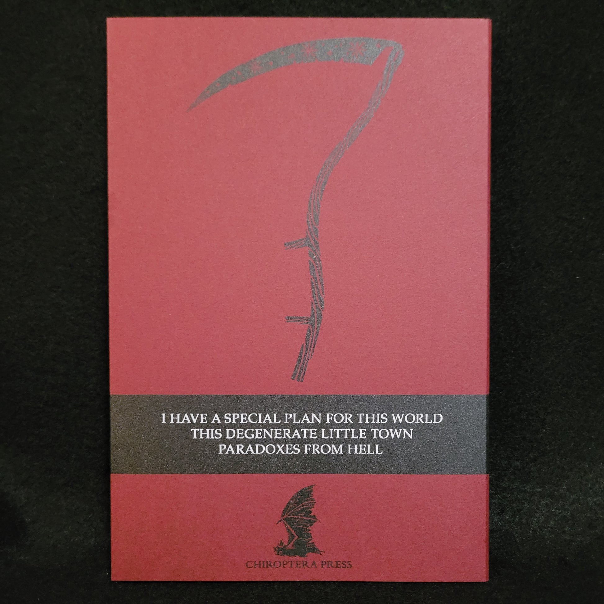 Thomas Ligotti. Paradoxes From Hell. Chiroptera Press, 2022. Paperback. 55 pages. Limited to 300 hand-numbered copies. Second Chiroptera Press Edition. Artwork and design by Jonathan Dennison.