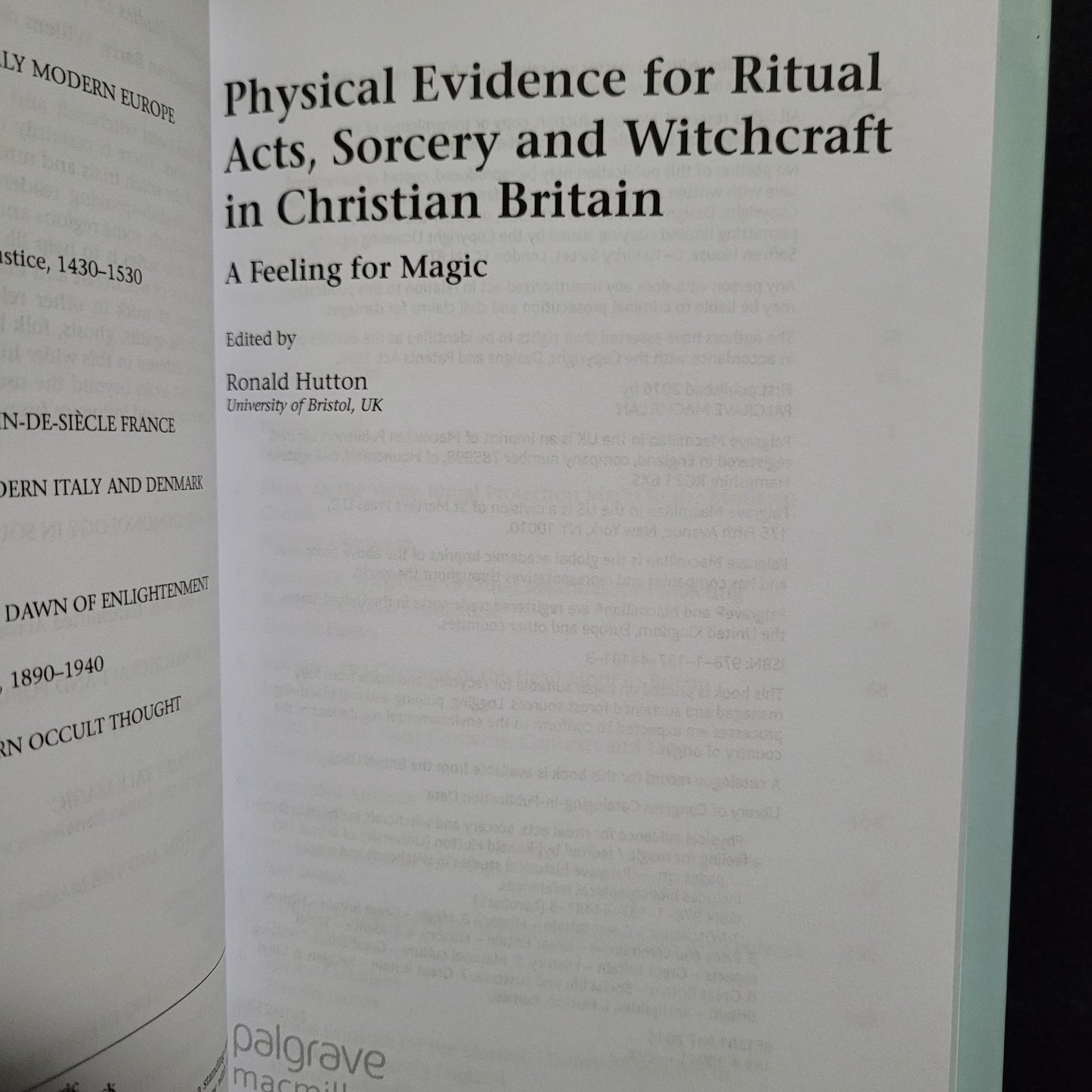 Ronald Hutton, editor. Physical Evidence for Ritual Acts, Sorcery and Witchcraft in Christian Britain: A Feeling for Magic, Palgrave Historical Studies in Witchcraft and Magic. New York: Palgrave Macmillan, 2016. Hardcover edition. 261 pages.